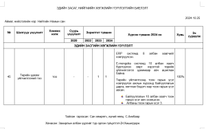 Бодлогын баримт бичгийн тайлан мэдээ Эдийн засаг нийгмийн хөгжлийн үзүүлэлт Админ - 2024-12-03 99 Хариуцсан ажилтан Сан хөмрөгч, хүний нөөцийн ажилтан С.Анхбаяр Мэдээлэл авах дугаар 70543194